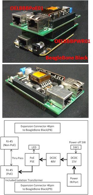 The OELBBBPoE01 is PoE(Power over Ethernet)/PSE (Power Sourcing Equipment) board docked on BBB (BeagleBone Black) with a needed intermediate board.